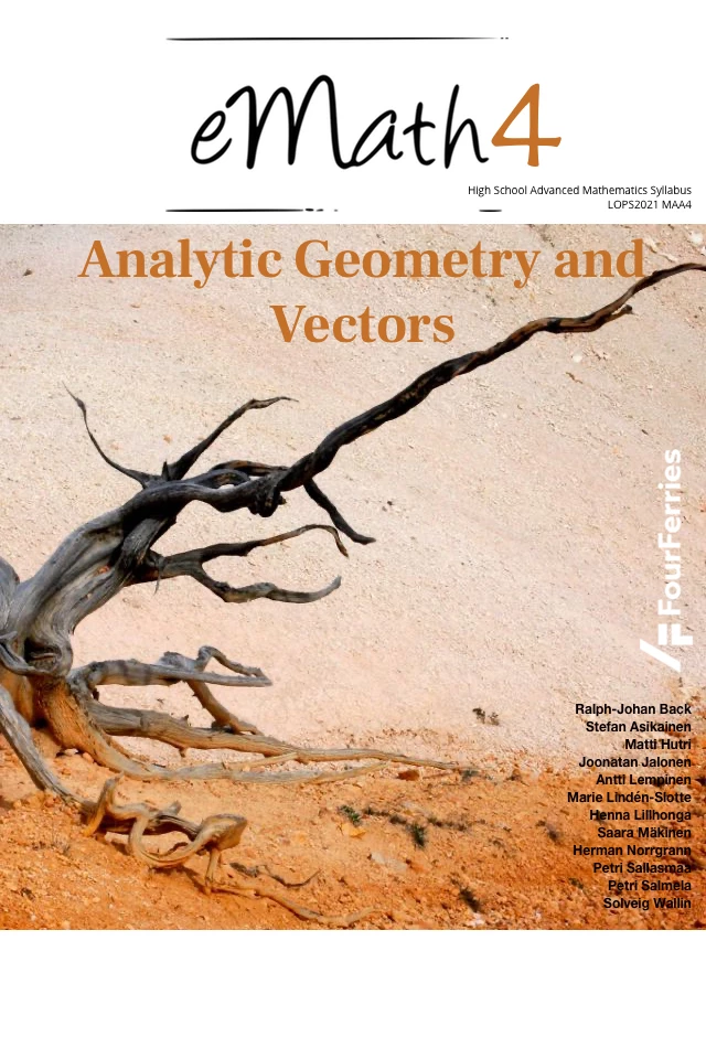 In eMath4, students are introduced to how analytic geometry connects geometric and algebraic concepts. They review their understanding of the geometric meaning of an equation and learn to solve absolute value equations. Students are introduced to the concept of vectors and learn how to perform calculations with them, as well as how to use vectors to examine points, distances, and angles in the two-dimensional coordinate system. In addition, they learn to solve plane geometry problems using vectors. The book also introduces students to the use of software tools for exploring curves and vectors, as well as for solving related applied problems.