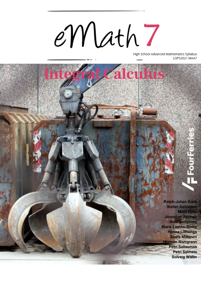 In eMath7, students are introduced to the concept of the antiderivative and learn how to determine antiderivatives of simple functions. They learn to understand the concept of the integral and its connection to area, as well as how to determine an integral using a numerical method. In addition, students learn how to calculate areas and volumes using integrals and become familiar with applications of integral calculus. The book also introduces students to the use of software tools for exploring the properties of functions, finding antiderivatives, computing integrals in applied contexts, and performing numerical integration.